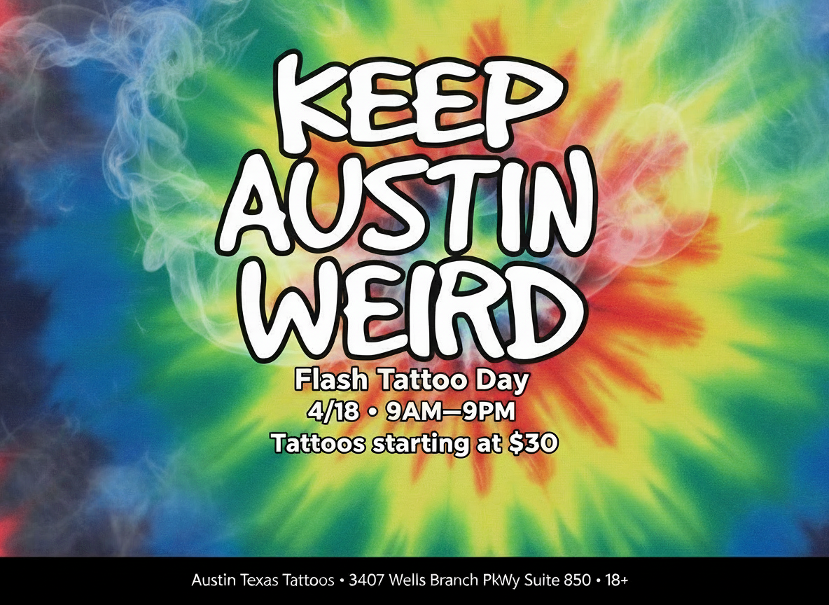 On April 18, I’m hosting a Keep Austin Weird flash tattoo event with a full menu of Austin-inspired designs and Texas-native nature pieces. Expect everything from iconic landmarks and local tributes to stoner-friendly, tie-dye vibes all designed to be quick, clean, and fun.